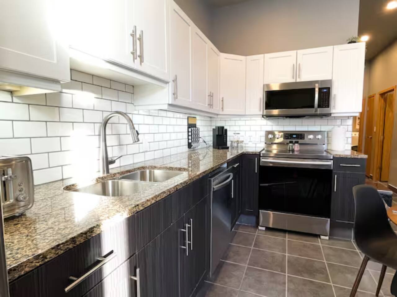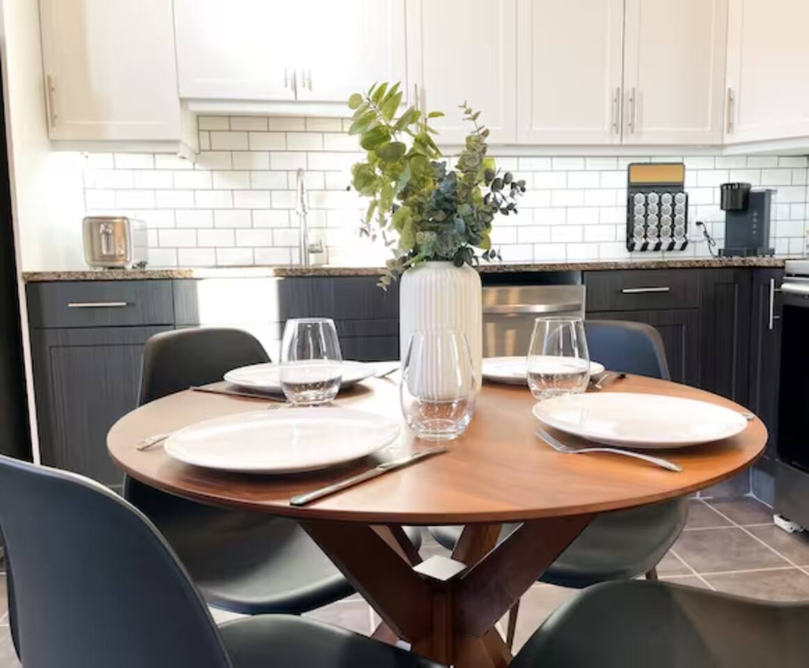 Here’s what you’ll find inside: 🛏 Bedrooms: Two private bedrooms, one King and Queen bed, fresh white linens, and closet space for your belongings 🛁 Bathroom: One modern full bathroom with a tub/shower combo Fresh towels, hairdryer, and basic toiletries provided 🍳 Kitchen & Dining: Open-concept kitchen with stainless steel appliances, granite countertops, dishwasher, and microwave Fully stocked with cookware, dishes, utensils, coffee maker, and kettle Dining area great for meals or remote work 🛋 Living Space: Spacious living area with cozy seating and a welcoming, modern feel Smart TV for streaming and free high-speed fiber internet 🧺 Laundry: Shared laundry located within the building (detergent provided) 🚗 Parking & Location: Free designated parking space for one vehicle Additional paid street parking nearby Centrally located in the Waterfront District—steps from local restaurants, coffee shops, and boutiques Short drive to: • Marina Park (3 min) • Hillcrest Park (5 min) • Lakehead University (10 min) ✨ Additional Touches: Private entrance and self check-in Central heating for year-round comfort Locally curated digital guidebook with our favorite Thunder Bay spots